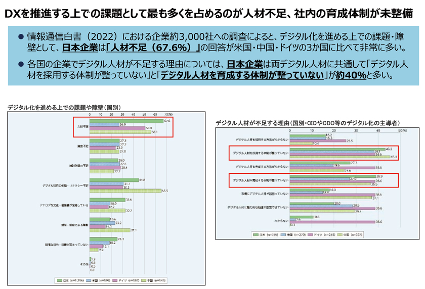 CIOが注目されている主な理由としては、DX推進の必要性、デジタル競争力の低下、そして人材不足の課題が挙げられます。経済産業省は2018年の「DXレポート」で2025年までのデジタル企業への変革を促しており、IMDの調査では日本のデジタル競争力が63カ国中29位と低迷している状況です。また、総務省の2022年調査では、日本企業の67.6%が「人材不足」をデジタル化の障壁として挙げています。