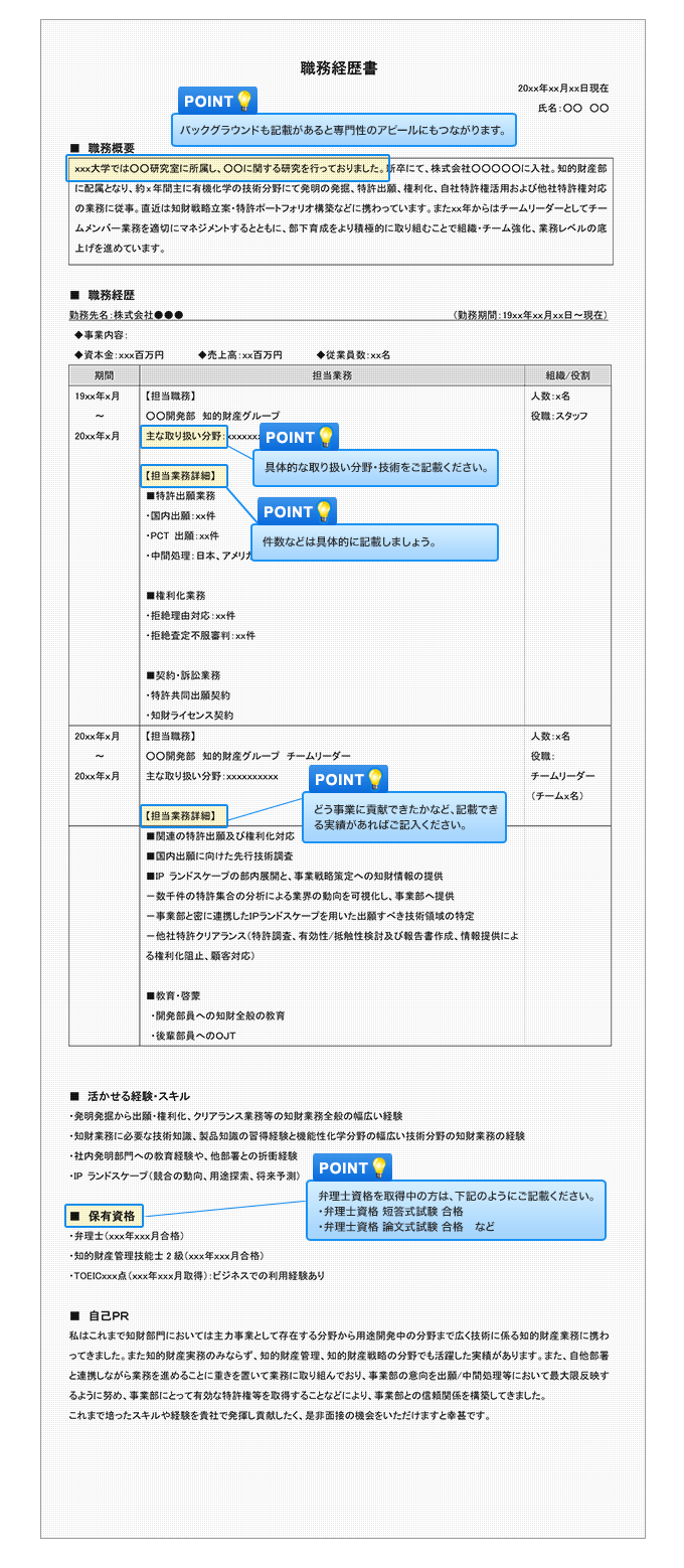 「知的財産」の職務経歴書を作成する際に役立つサンプル・テンプレートをご用意。職種別の書き方ポイントも解説しています。