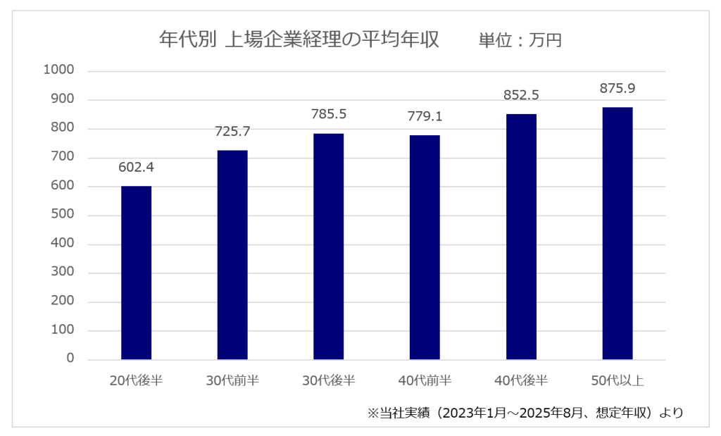 上場企業の経理は、専門性の高い職務であり、年収も一般的な事務系職種と比べて高水準の傾向にあります。JACが2023年1月から2025年8月に支援した上場企業経理関連職種の転職データによると、全体の想定平均年収は770万円程度であり、専門性の高さが報酬に反映されています。