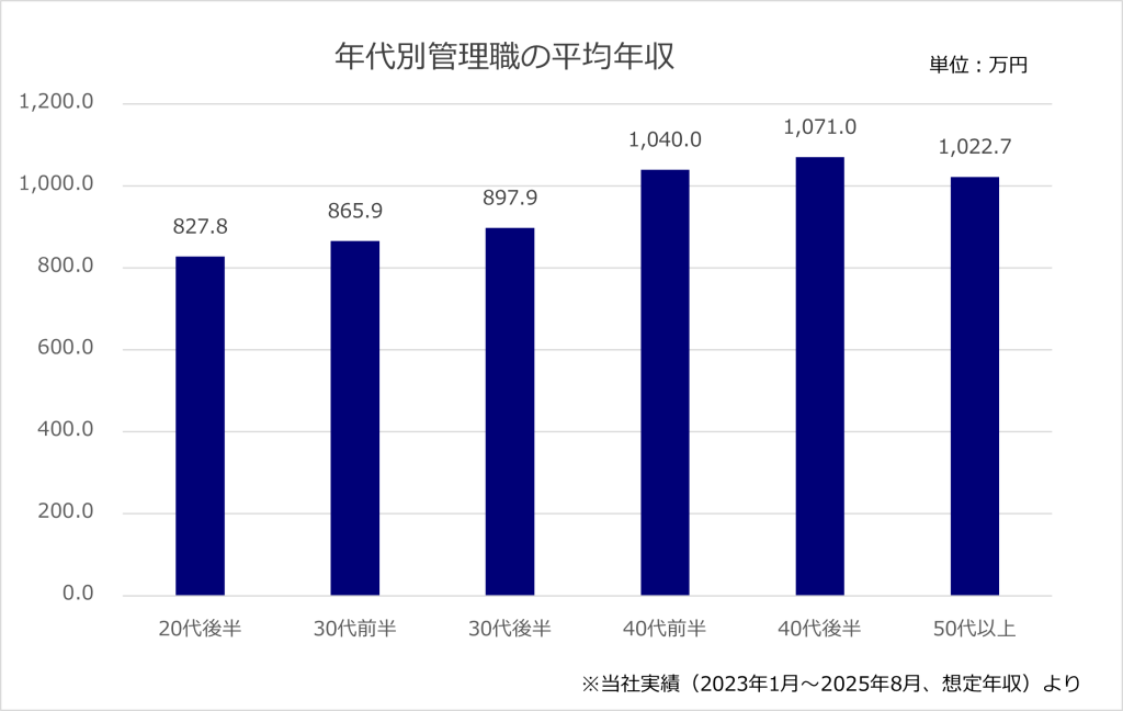 JACの実績では、管理職の平均年収は1,028.2万円です。年収が最も多く分布しているのは600万〜1,400万円のゾーンで、年齢を重ねるごとに年収も上昇し、40代後半では1,071.0万円、50代以上でも1,022.7万円と高水準を維持しています。