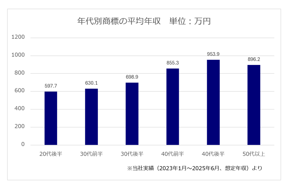 JACの実績※では、商標の平均年収は約789.3万円です。年収のボリュームゾーンは600万~1300万円となっています。下記の表は年代別の平均年収ですが、企業規模や担当する領域、これまでのご経験によって、20代でも年収が900万円を超えるケースや、30代で年収1,200万円以上、40代で年収1,600万円以上のケースもあります。