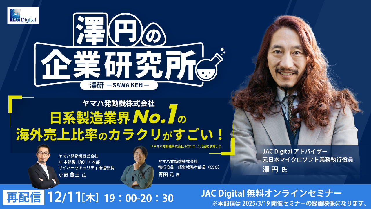 新規事業を担う青田氏と、成長を支えているIT部門を担う小野氏をゲストに迎え、澤円氏がヤマハ発動機の魅力を深掘りしておりますので、ぜひご視聴ください。