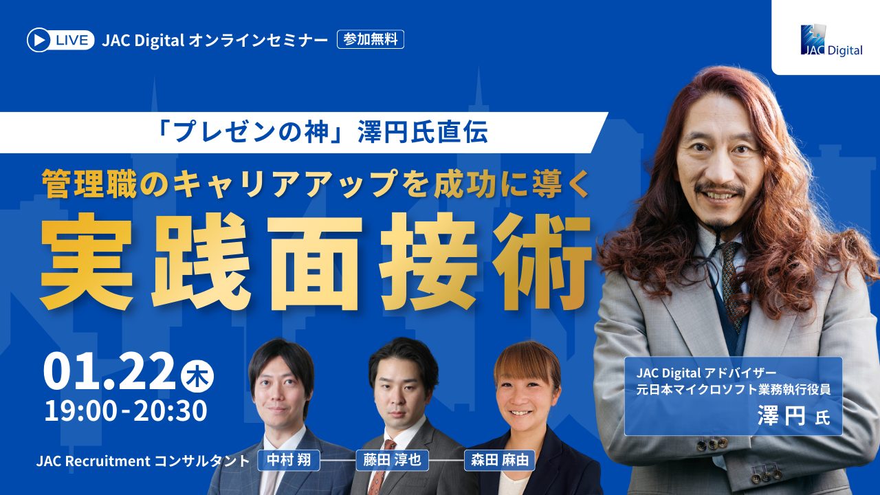 そこで、管理職のキャリアアップを成功に導く面接術を、JAC Digitalアドバイザーの澤円氏がレクチャーします。