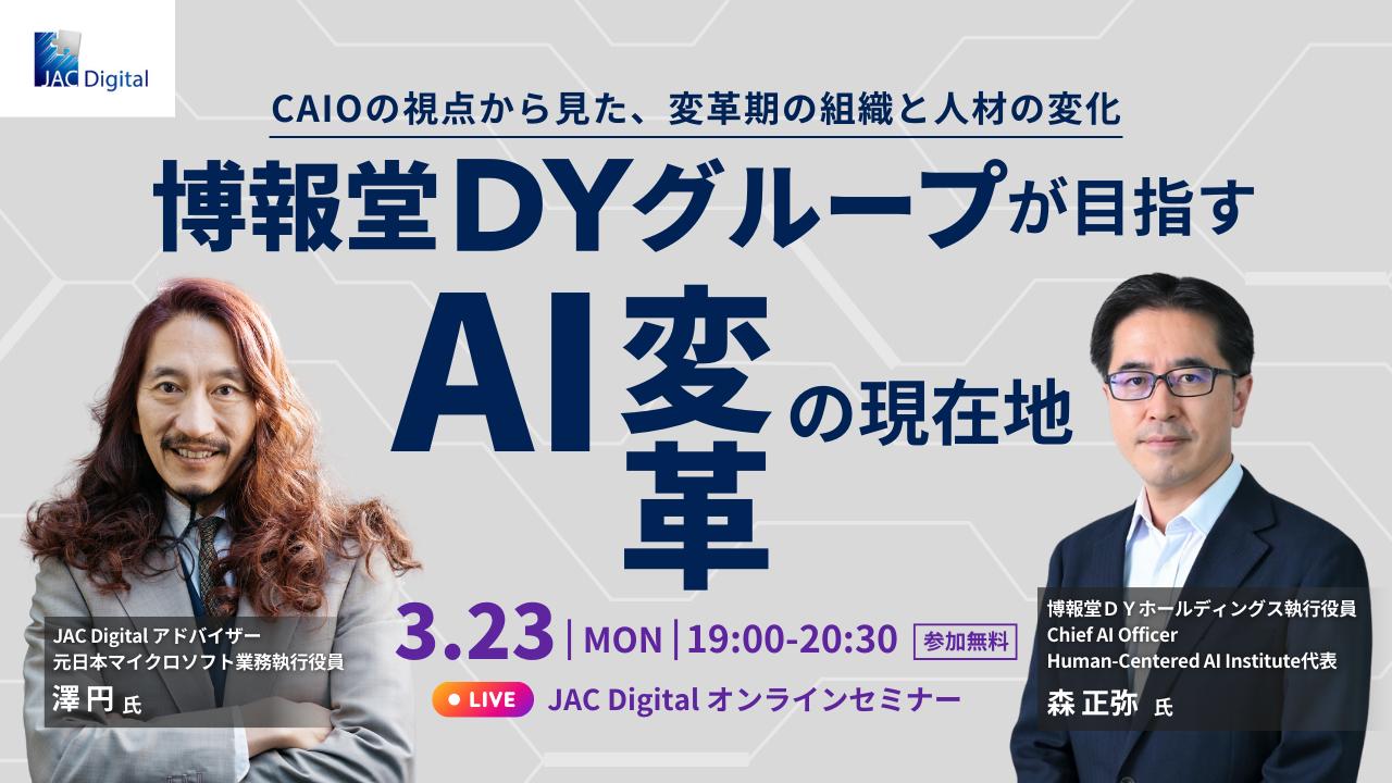 今回のセミナーでは、博報堂DYホールディングス執行役員 Chief AI Officer(CAIO)の森正弥氏をゲストにお迎えし、現在の取り組みや、CAIOの視点から見た、変革期における組織と人材像の変化について、JAC Digitalアドバイザーの澤円氏と語っていただきます。