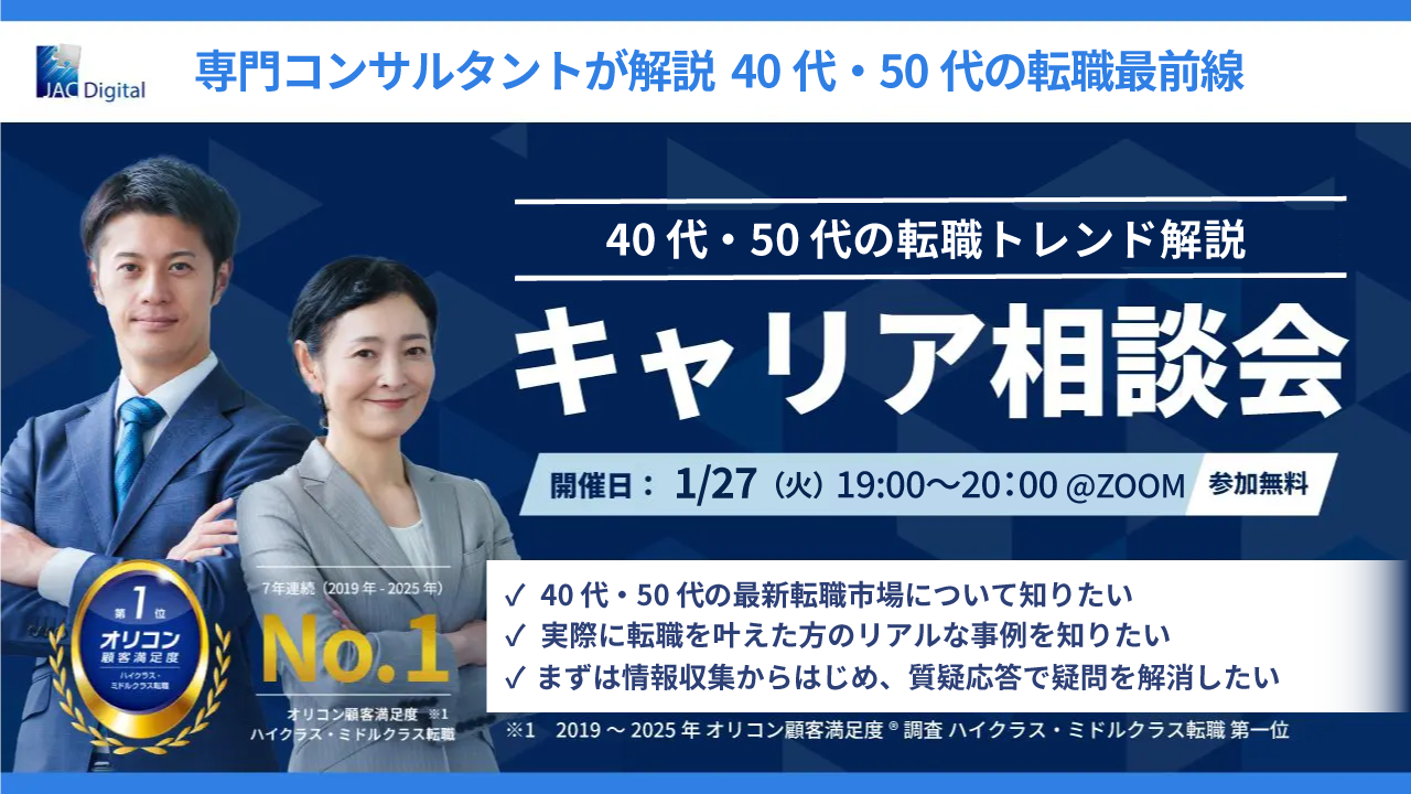今回のセミナーは、最新の転職市場動向および実際のご支援事例をジェイ エイ シー リクルートメントのコンサルタントが解説するコーナーと、質疑応答コーナーの2部制としており、今後10年、20年と長く活躍し続けるためのキャリアのヒントをご提供します。
