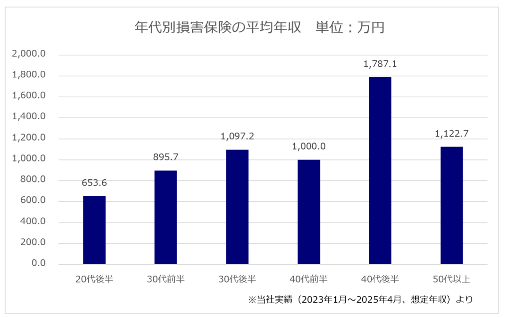 JACの実績※では、損害保険業界の平均年収は約1,130.6万円です。年収のボリュームゾーンは750万円~1,250万円となっています。下記の表は年代別の平均年収ですが、企業規模や担当する領域、これまでのご経験によって、20代でも年収が1,000万円を超えるケースや30代・40代で年収3,700万円以上のケースもあります。
