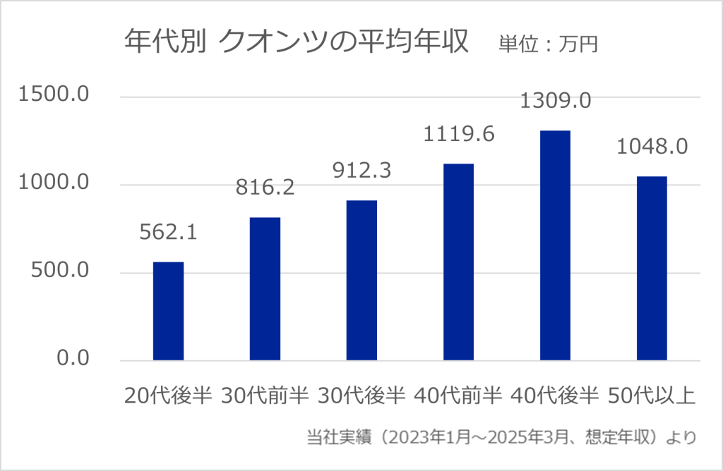 JACがご支援したクオンツの平均年収は905,3万円で、ボリュームゾーンは年収900万円~1,200万円です。各年代の平均年収は下記のとおりです。