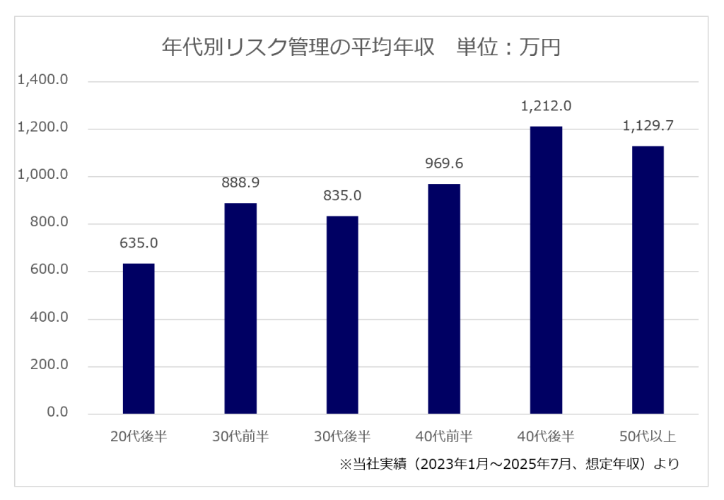 2023年1月~2025年7月の間にJACが転職をサポートした実績を見ると、リスク管理領域の平均年収は約922.6万円です。700万円~1,100万円で転職を決定された方が最も多くなっています。