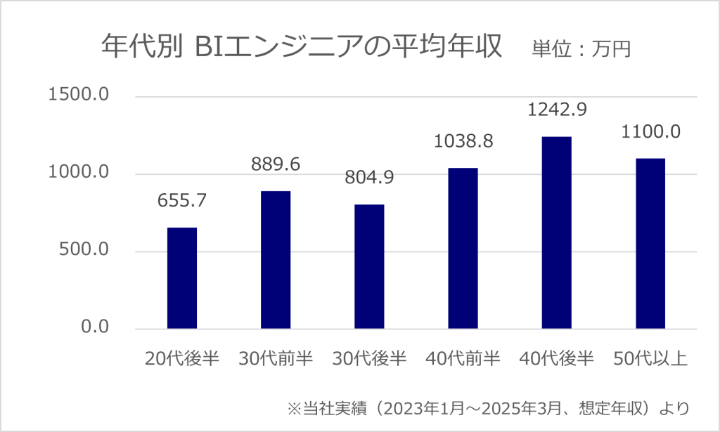 ただし、スキル・経験によって大きく変動します。高度なスキルを持つBIエンジニアは、20代で年収1,000万円以上を得ることも可能です。また、マネージャー以上の場合は1,500万円以上の年収の方もいらっしゃいます。