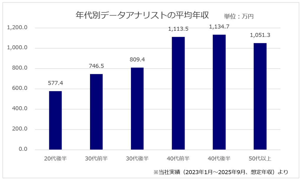 年代別に見ると、20代後半で平均577.4万円、30代前半で746.5万円と、早期から専門性に応じた高い給与水準が期待できます。さらに40代前半には平均年収が1,000万円を超え大幅に上昇。この数字から、経験を積み、より戦略的な分析や意思決定支援に携わることで報酬が飛躍的に伸びる職であるといえます。さらに、50代以上でも1,051.3万円と高水準を維持していることから、専門性を軸に長期的なキャリア形成が可能であるといえるでしょう。