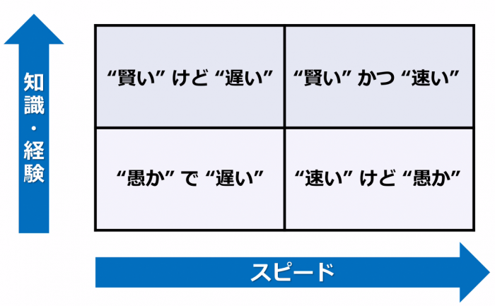ここに4象限のマトリクスを1つ用意しました。縦軸が「知識・経験」、横軸が「スピード」です。これを、キャリアとか人材というところに当てはめて今から話してみたいと思います。