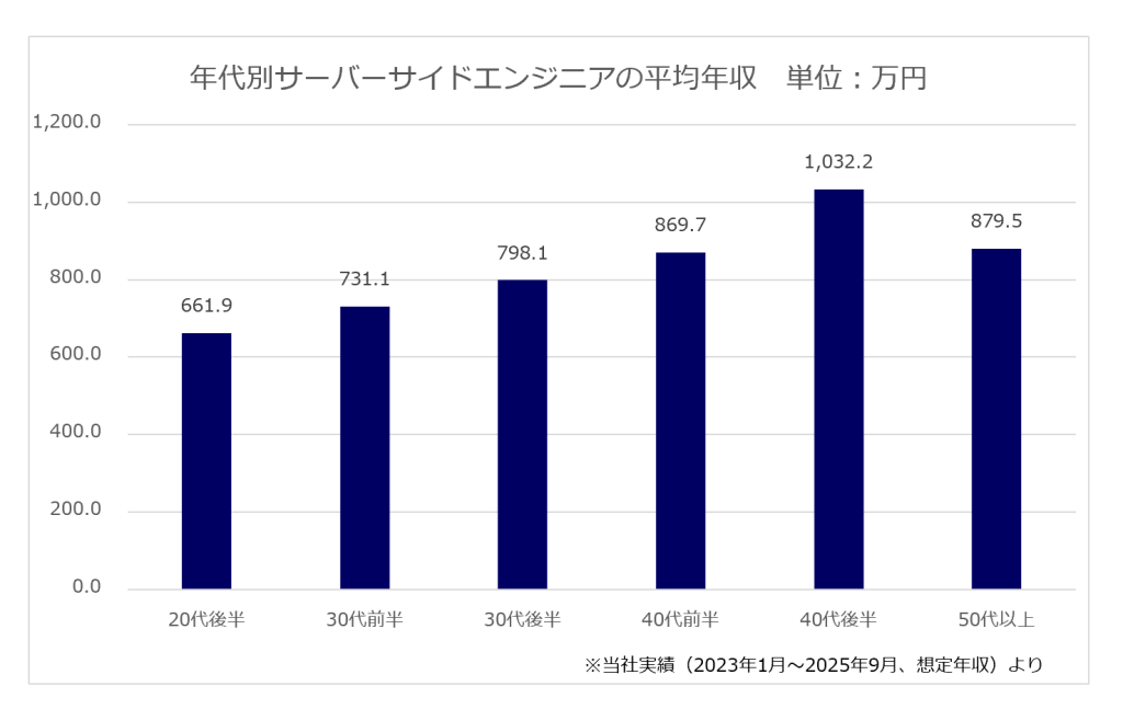 JACの2023年1月から2025年9月の実績では、サーバーサイドエンジニアの平均年収は約789.7万円です。年収のボリュームゾーンは650万円~850万円ですが、企業規模や担当する領域、経験によっては、20代でも年収が1,200万円を超えるケースや30代で年収1,800万円以上、40代で年収1,600万円以上のケースもあります。なお、下記の表は年代別の平均年収を示しています。