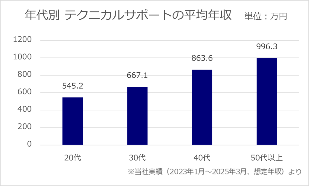 テクニカルサポートの年代別の想定平均年収は次のとおりです。