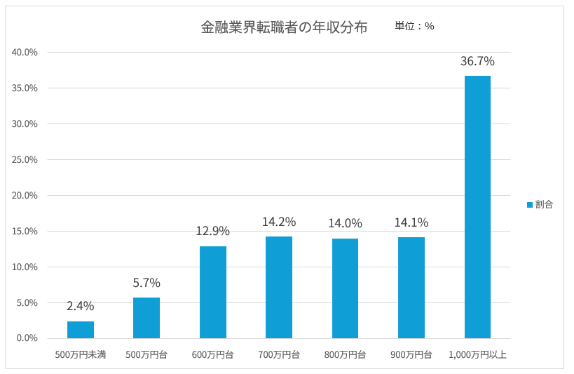 課長以上の管理職ポジションへの転職割合も全体の約24%に達しており、マネジメント層への転職支援にも強みをもっています。以下は金融業界へ転職した方の年収分布です。