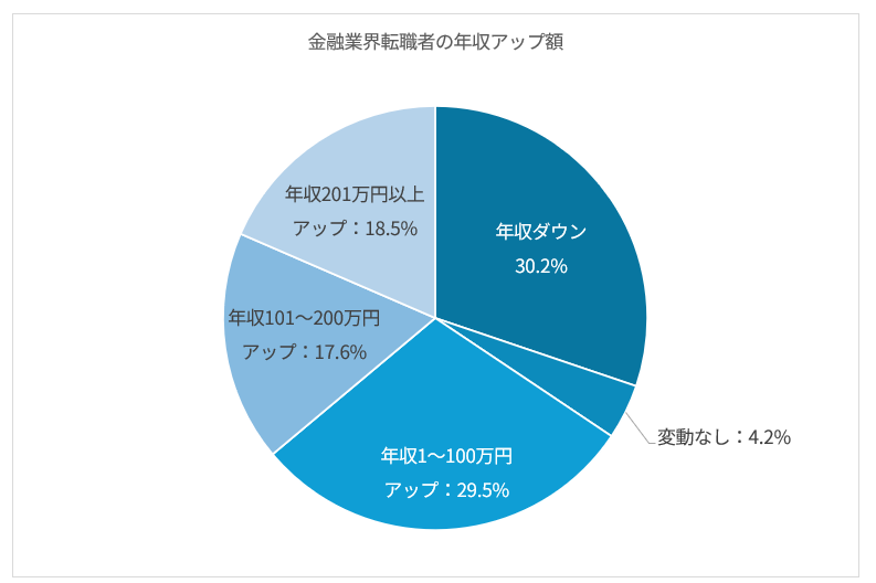 年収アップした方の内訳を見ると、1〜100万円アップが29.5%と最も多い一方で、201万円以上の大幅アップを達成した方も18.5%にのぼります。101万円以上アップした方を合計すると36.1%に達し、金融業界への転職が大きな年収向上につながるケースは珍しくありません。