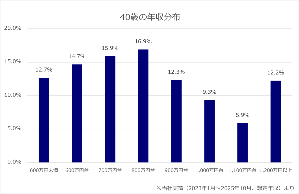 JACの2024年実績データによると、40歳の年収中央値は826.2万円です。年収分布を確認すると、600万〜800万円のレンジに登録者が多く集まっており、この水準が40歳成約者のボリュームゾーンと捉えられます。