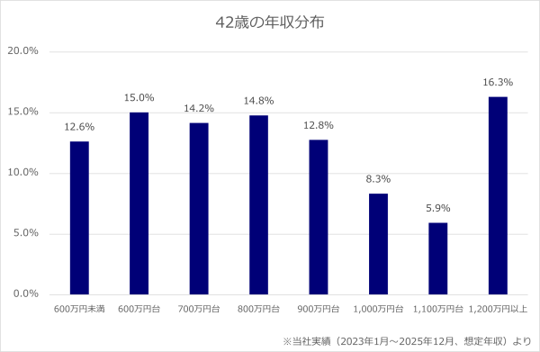 一方で、年収600万円台以下の人の割合も27.6%となっており、42歳はこれまでのキャリア選択によって年収差が明確に表れる年代といえます。