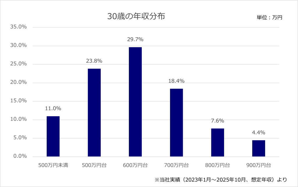 JACの実績では、30歳の年収中央値は642.0万円です。分布データを見ると500万〜700万円帯に偏っており、このレンジが30歳の中心層といえます。