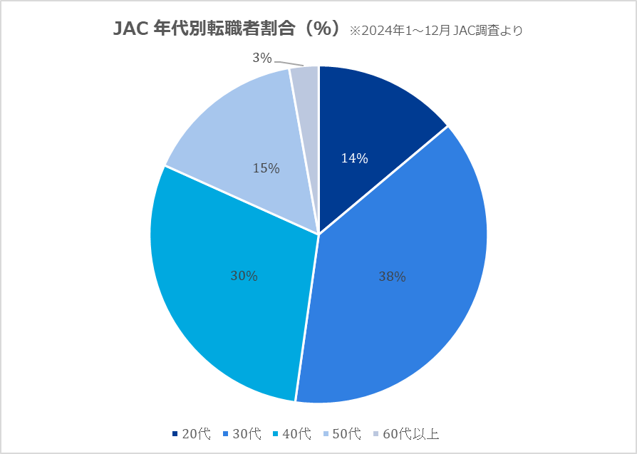 JACの年代別転職者割合(2024年)によると、転職成功者のおよそ14%が20代です。