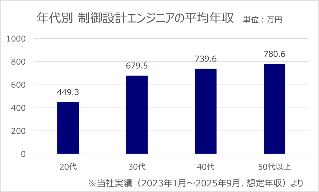年代別にみると、20代で449.3万円、30代で679.5万円と、30代から報酬の上昇が顕著になります。さらに40代で739.6万円と上昇を続け、50代以上では780.6万円と安定した高水準を維持しています。キャリア初期から技術領域を広げ、上流工程や設備全体の統合設計に関わることで、早い段階から報酬水準を高めることが可能です。