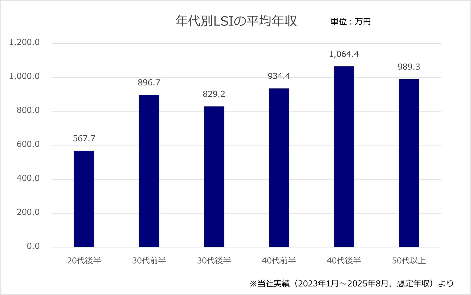 JACが取り扱うLSI設計求人の全体的な想定平均年収は840万円程度であり、技術職のなかでもトップクラスの水準に位置しています。年代別にみると20代後半で約570万円、30代になると830万円台〜900万円台を推移します。さらに、40代前半では930万円台、40代後半では1,060万円を超えます。