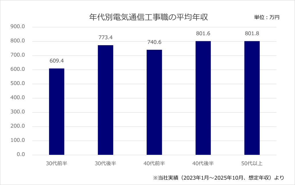 以上のように、電気通信工事分野の年収相場は年代や役職によって大きく変動する一方、全体として安定した高水準を維持しています。キャリア形成の方向性次第で、昇進や異業種連携を通じた年収の伸長が十分に見込める分野であるといえるでしょう。