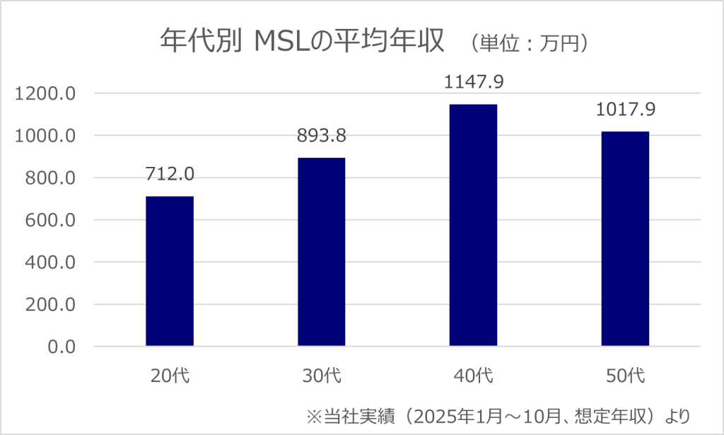 20代は700万円台で推移し、専門性を積み上げる時期といえます。その後、30代で約900万円まで伸び、40代は1,147.9万円と高水準に達します。シニアMSLや組織の中核を担う役割を任される年代で評価が高まる点が特徴です。