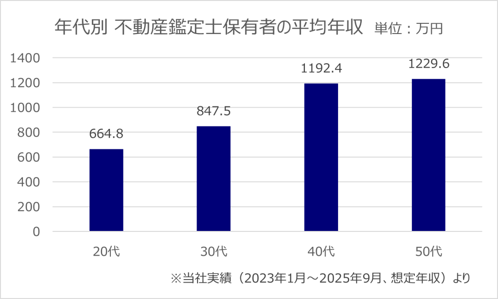 JAC が取り扱う不動産鑑定士関連求人の全体想定平均年収は923.9万円と高水準にあり、安定した年収レンジが形成されています。年代別に見ると、20代で664.8万円、30代で847.5万円と順調に上昇し、40代では1,192.4万円に到達します。特に40代以降は、鑑定実務に加えてチームマネジメントや案件組成などを担うケースが多くなるため、経営職と同水準の報酬が提示されるケースもあります。