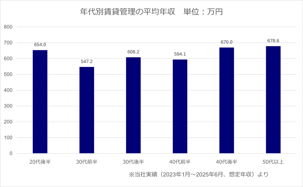 2023年1月~2025年6月の間にJACが転職をサポートした事例を見ると、賃貸管理関連職の平均年収は、633.6万円です。また、ボリュームゾーンは600万円~800万円程度となっています。グラフを見ても分かるように、賃貸管理職では、年代ごとの平均年収に大きな差はありません。年齢や経験にかかわらず、実力が重視される職種だと考えて良いでしょう。
