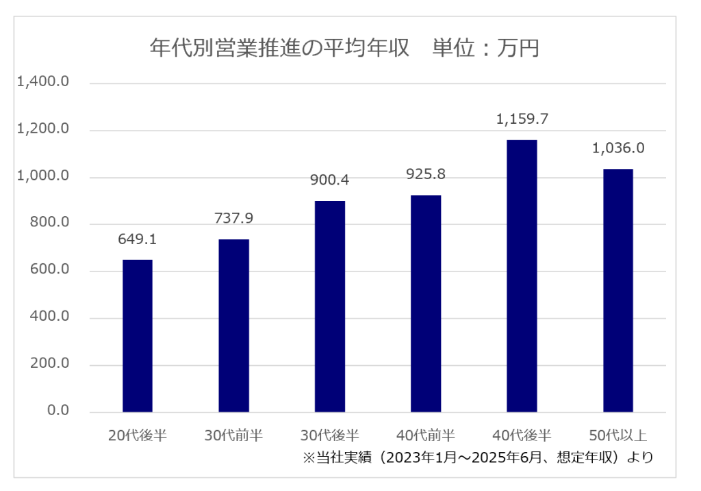 JACの実績※では、営業推進の平均年収は約871.9万円です。年収のボリュームゾーンは700万円~1,000万円となっています。下記の表は年代別の平均年収ですが、企業規模や担当する領域、これまでのご経験によって、20代でも年収が850万円を超えるケースや30代で1,100万円以上、40代で1,600万円以上のケースもあります。