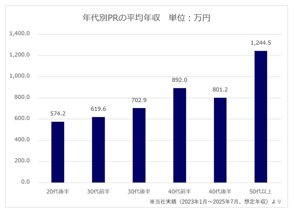 JACの実績※では、PRの平均年収は約742.4万円です。年収のボリュームゾーンは600万円~800万円となっています。下記の表は年代別の平均年収ですが、企業規模や担当する領域、これまでのご経験によって、20代でも年収が700万円に迫るケースや30代・40代で年収1,400万円以上のケースもあります。