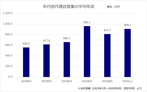 JACが取り扱う代理店営業求人の想定平均年収は、720万円程度です。年代別に見ると、20代後半で約560万円、30代前半で約620万円、30代後半で約660万円と着実に上昇し、40代前半には約960万円と高い水準に到達します。40代後半以降は約810万円から約910万円台を推移し、経験や役職による差が報酬に反映されている様子がうかがえます。