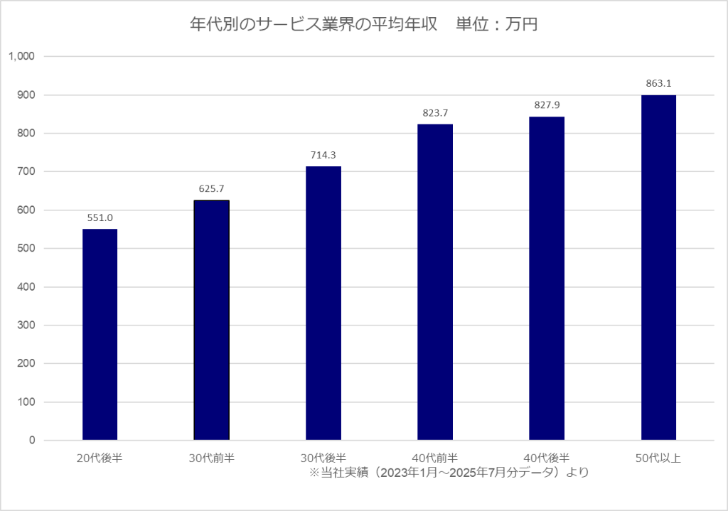 2023年1月~2025年7月までにJACが転職をサポートした事例を見ると、サービス業界の平均年収は774.8万円となっています。また、ボリュームゾーンは700万円~900万円程度です。